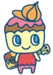 Amamelotchi resembles a custard pudding topped with chocolate or caramel and strawberry sauce, as well as an orange cap shaped like a cream dollop. He has blue eyes, a frilled red shirt, and pink pants. He also carries a guitar on his back, which appears to have a brown checkered pattern on it.