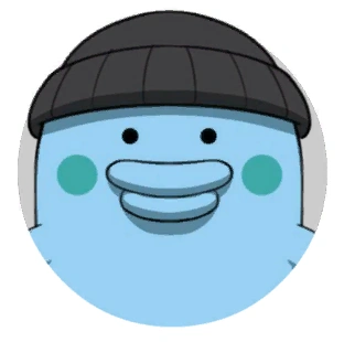 Beaniepatchi is a light blue Tamagotchi with a gourd shaped body. He has black beady eyes, teal colored cheek highlights, and wears a black beanie.