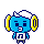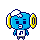 The Cymbal Brothers are two blue Tamagotchi with yellow cymbals on the sides of their heads. They wear a white cap, white shirt with a music note, and gray colored pants. They have a pale blue tuft of hair coming out from their cap, with one brother having it up while the other one has it down.
