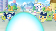 Kuchipatchi eats a banana, then throws the peel on the road in a failed attempt to make the vehicle slip on it and lose control. The vehicle is then revealed to be operated by Spacytchi and his brothers, who believe that the package contains Cocotama, prompting them to get the package in their continued mission to take over Tamagotchi Planet. The larger vehicle's mechanical claw then gets a grip on the package, resulting in a brief tug o' war between it and Memetchi and Lovelitchi, which ends with the package falling off a cliff before being picked up by Nijifuwatchi, who places it back in the large blue car-like vehicle.