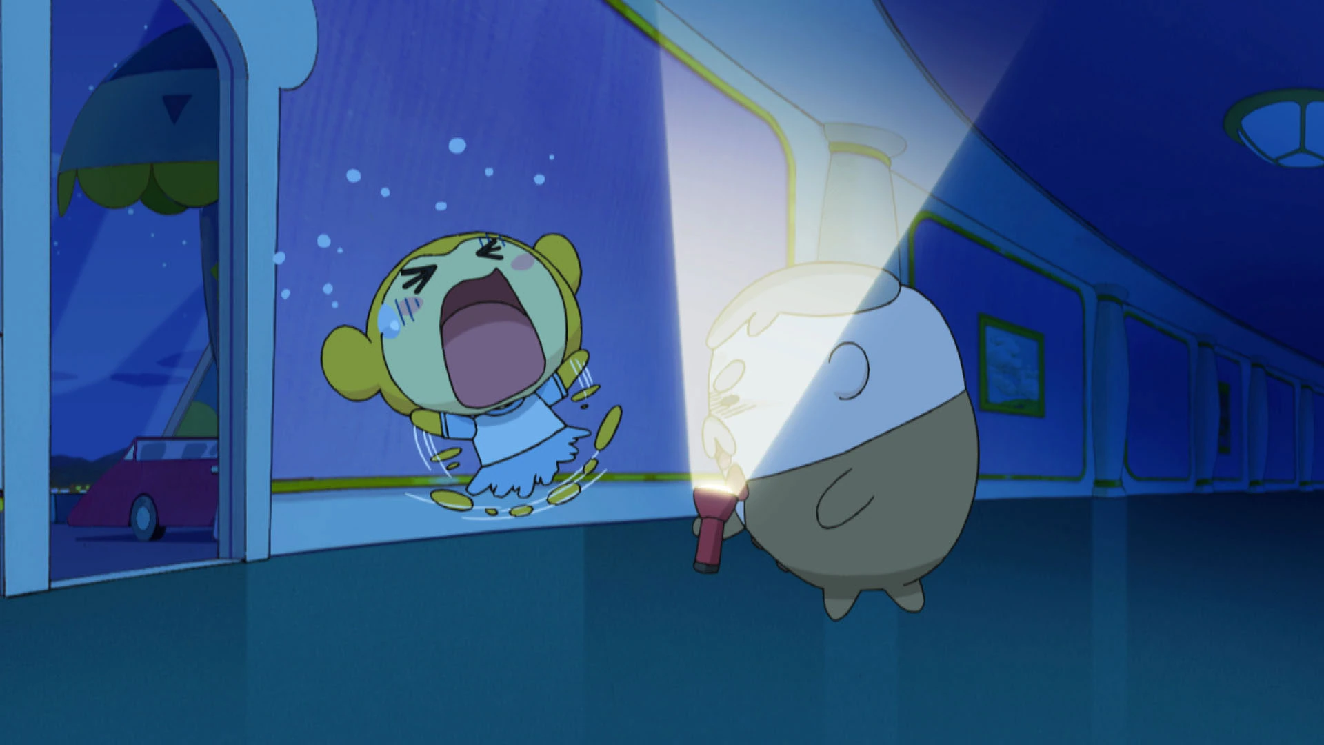 Kikitchi and Kodatchi eventually make it to the cave where Sebastiantchi left bananas behind as a reward for making it there. Kikitchi thanks Kodatchi for being with him and a Tama Heart appears behind them. Kodatchi then glows and starts disappearing, saying that he had a lot of fun with Kikitchi tonight. As Kikitchi stands in shock, the Tama-friends reach the cave and collect the Tama Heart which revealed itself as a Moon heart. Mametchi goes up to him to ask him if he's okay and Kikitchi runs away from the cave, screaming that Kodatchi was a ghost all along. The episode closes on Kikitchi's rear as Sebastiantchi looks exasperated at Kikitchi being scared again.