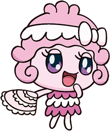 Furifuritchi has a pink body and wears a frilly pink and white dress. Her hair is curly and is adorned with a frilly white headband. She is often seen carrying around a pink fan.