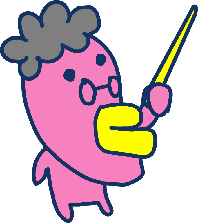 Guidetchi has light pink skin and a yellow beak. His eyes look like dots, and he wears glasses. His head is fairly large compared to the rest of his body, and he has curly gray hair. He holds a yellow pointer stick in his left hand.