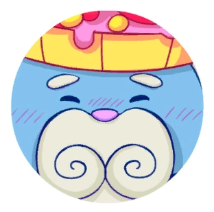 Gurugelatchi is a light blue Tamagotchi with a large round body. He has a big gray beard with that curls in on itself, a pink nose, closed eyes, and small round eyebrows. He wears a hat of ice cream on his head, a blue shirt, and yellow apron.
