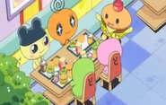 Happyburgertchi appeared in the first episode, Get Ready! The Big Race on Tama Street, monitoring the burger-making competition. In "Happy! Shops at the School Festival / Terrible! The GOTCHIMAN and Hero Show", he helps out Chamametchi with sourcing burgers for the Tamagotchi School festival.