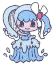 Harp Undine is a transformation exclusive to the Fairy Change Tama Deco Pierce. Harptchi is transformed into a water sprite sometimes known as an undine. Her hat, harp, dress and ribbon all become blue and are made of water, and she sits on a small geyser or waterfall to play.
