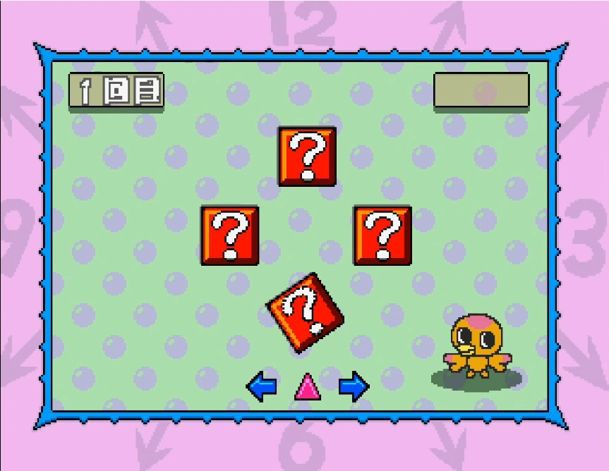 - Shuffle Game: This game consists of five rounds and at least three must be won to increase intelligence. Losing the game decreases intelligence. A ball is deposited into one of four boxes, which are then swapped with each other or spun around very quickly, and the goal is to guess which box the ball is in. Pressing left or right changes which box is highlighted and the circle button selects the current bin. This game increases intelligence.