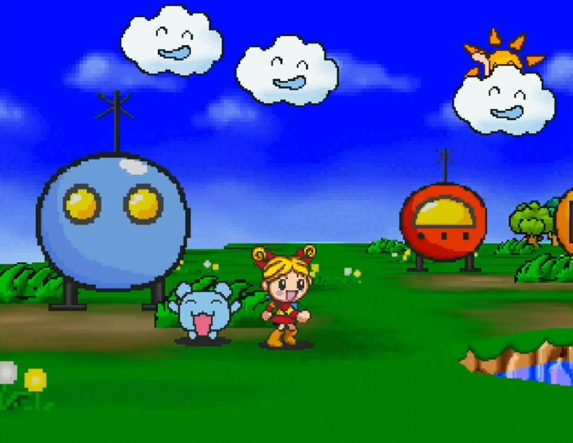 The player directly controls Mikachu as she travels in the overworld. A bicycle is also available to use to go faster, though Mikachu can't interact with any wild Tamagotchis while riding it. If a Tamagotchi has been befriended and is currently staying at the UFO, they can accompany Mikachu when she goes out and they can visit certain facilities.
