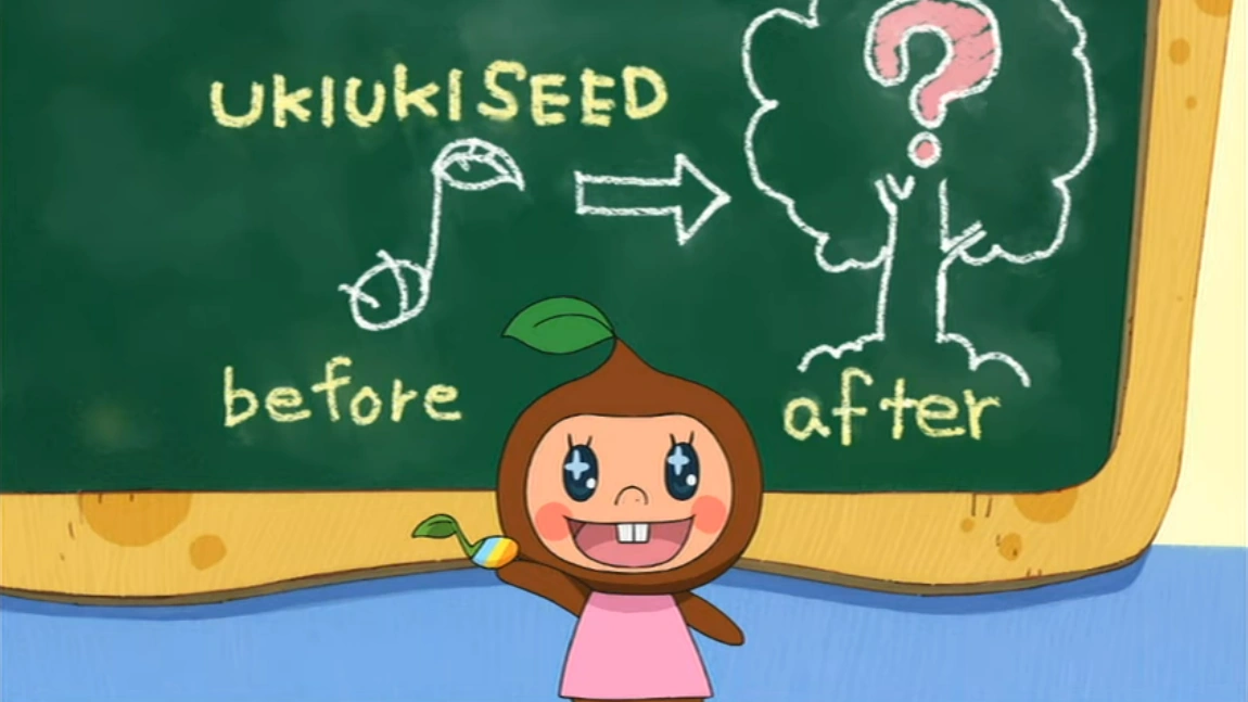 Grippatchi gives her class an assignment where they must grow a jolly tree seed and draw a picture of the tree that grows from it. Mametchi uses a rube goldberg machine to water his seed as he is busy trying to make a machine that spreads happiness. As a result, everyone's seed has fully grown into a tree except for Mametchi's which remained a sprout. Mametchi is initially sad about it until Hapihapitchi sprinkles some happiness on him to make him feel better.