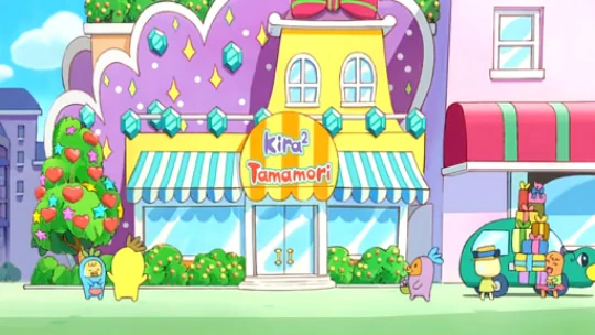 Similar to the Tamamori Shop, Kirakira Tamamori Shop is a Tamamori fashions provider in Dream Town. The store's manager is Kiramamatchi. Both Kiraritchi and Kiramotchi work in the store, and Yumemitchi sometimes comes over to help. The store sells various sparkling accessories.