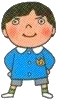 Kujiraitchi resembles a young human girl. She has black hair in a bowl cut. She wears a blue jacket with white buttons and a white collar, gray shirts, green socks, and white shoes. Her outfit resembles a Japanese kindergarten or preschool uniform.