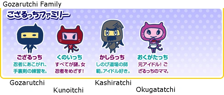 Kunoitchi has pink skin and wears a cat-like red ninja suit with whiskers and a tail. She looks a bit like her brother Gozarutchi.