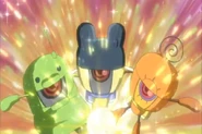 Finally, the Tamatomos face against the Ikazuchi3. Mametchi is initially still doing all the work until Kuchipatchi steps in to block a ball from hitting the goal. Memetchi also steps in to block more balls and Mametchi is glad to see his friends looking out for him. The three then huddle together and the Ikazuchi3 prepare a powerful attack to blow their robots away. However, a pink shield forms from their huddle and blocks all the attacks they try. As they huddle together, Mametchi remembers when Memetchi and Kuchipatchi held on him during a storm so he wouldn't fly away. Eventually, the Ikazuchi3's robots are overwhelmed and short circuit, allowing the Tamatomos to score a goal and win.