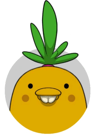 Manbunpatchi is an muted orange Tamagotchi with a gourd shaped body. He has black beady eyes, buckteeth, and green spiky hair tied up with a red tie.