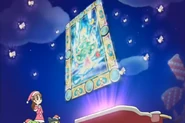 All of a sudden, the snow starts glowing. Several Tama Hearts emerge from the snow and rise into the sky. Lovelitchi and Melodytchi both tap their Tama Profys, and all the Tama Hearts turn into Star Hearts. Then Santaclautchi's sleigh starts glowing. A mysterious plate with a picture of a Christmas tree rises from it. All the Star Hearts float to the mysterious plate, surrounding it, and then a Tree Heart emerges from it. The Tree Heart separates into two, and both of them go into the Tama Profys, followed by all the Star Hearts.