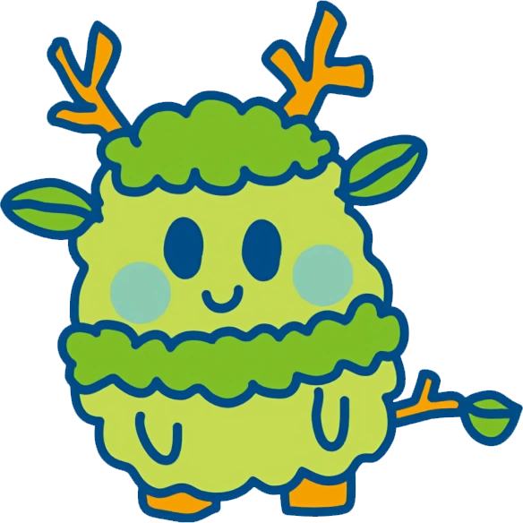 Morijikatchi has a light yellow-green bushy body with dark oval-shaped eyes and blue cheeks. The area around his neck and on top of his head is a darker shade of green than the rest of his body. He has two leaves on each side of head that resemble ears, and light brown branches coming out of his head that resemble antlers. He has a tail that resembles a light brown twig with a green leaf at the end, and light brown feet.