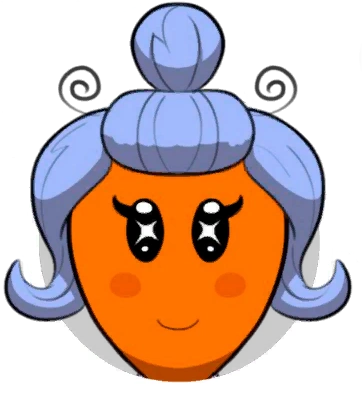 Obagurutchi is an orange Tamagotchi with a triangular shaped head and slim body. She has oval eyes with sparkle shaped pupils, dark orange cheek highlights, and gray hair which hangs off the sides of her head and is also tied in a bun. There are additionally two curls next to the hair bun. She wears a purple dress with a cream colored collar and buttons.