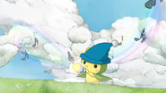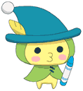 Otogitchi has a yellow body and wears a green coat that has also has a hood. He wears a blue green hat with a feather sticking out and is usually holding a magic crayon.