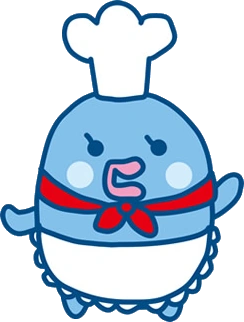 Shakertchi has a round blue body. She has two circular eyes with curled eyelashes, blue cheek spots, and a pink beak. She wears a red ribbon tied around her neck, a chef's hat on her head, and a large white apron.