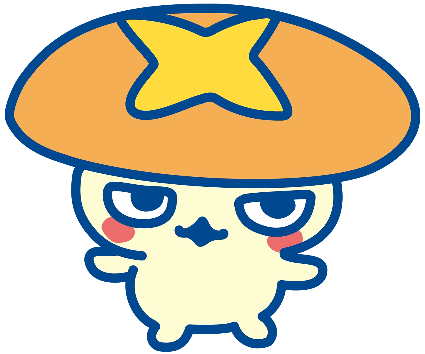 Shiitaketchi resembles an anthropomorphic Shiitake mushroom with a light brown shiitake mushroom cap on top of its head. It has a light yellow body with two arms and legs. It has two half-lidded eyes, a small cat-like mouth, and two red cheeks.