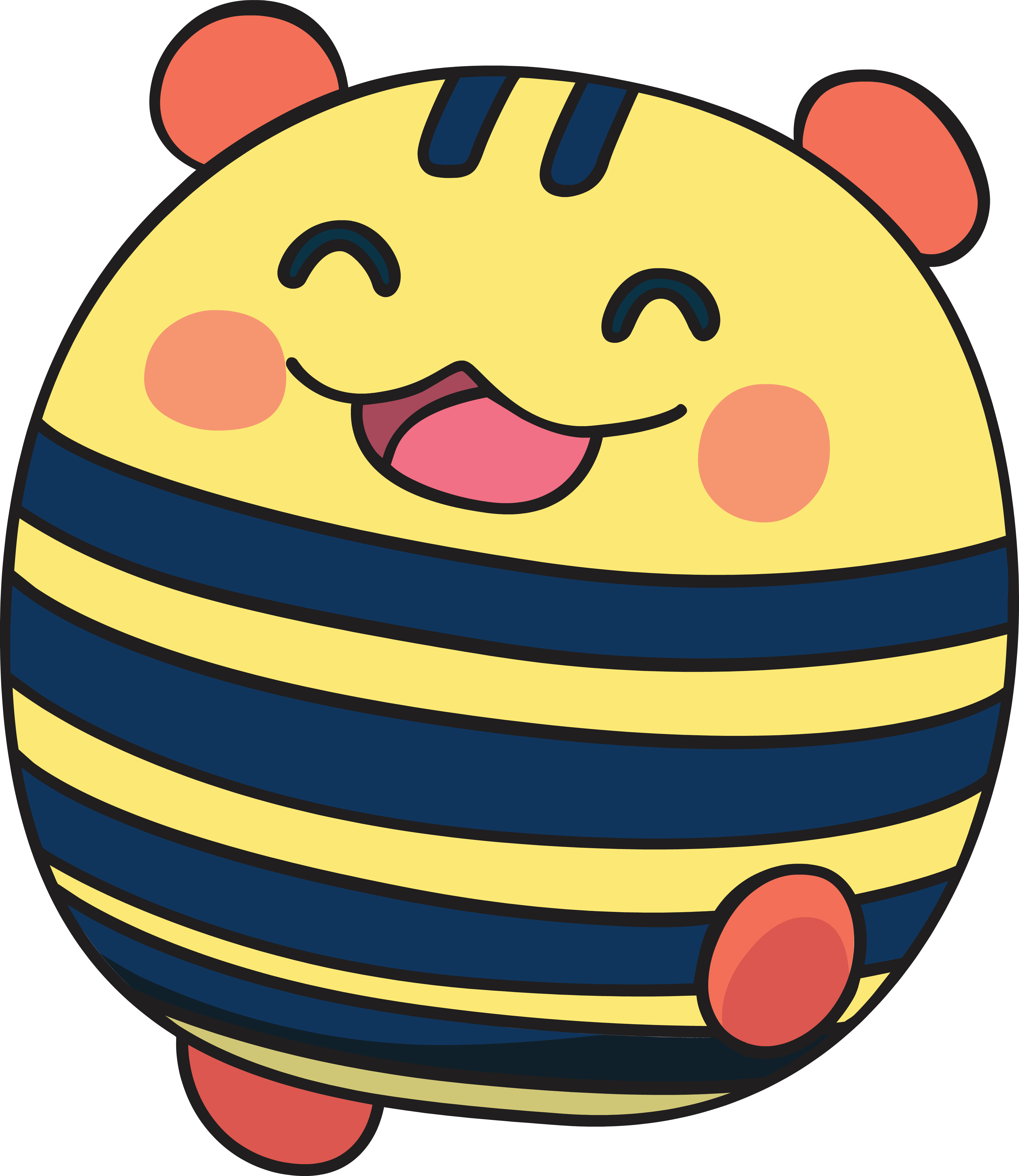Shimashimatchi is yellow with black stripes, somewhat resembling a bumble bee. He also has pink cheeks and small round orange feet and ears. When he gets angry, his stripes turn to zig-zags.