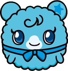 Sopratchi has a blue round body with with fluffy fur, round ears, and small round arms. She has a blue star shape on her left ear. She has dark blue eyes with sclera, and a curled eyelash on each of them. She has two tufts of hair on her forehead, one is pointed and the other is curly and round, and together they resemble a musical note. She wears a dark blue scarf, which is tied in a bow in the front.