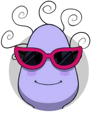 Sunnygurutchi is a light purple Tamagotchi with a slender oval shaped head and slim body. She has five prominent curls on her head and purple cheek highlights. She wears red sunglasses and pink and white striped skirt.