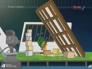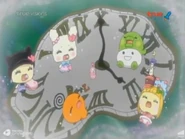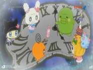 Mametchi states that their chance of fixing the issue probably lies back at the control room and they return there. He says that if he can power the main unit again, then time should move normally. Kizunatchi worries that they could mess up time even more, aging everyone or making them turn into babies, but Mametchi says they have no other option. He pushes the lever again, but nothing happens as the power to the main unit is dead. Mametchi then has Tomomi and Kizunatchi gather a few items in TAMAX-TV so he can repower the machine. Tomomi grabs a power cord from Kakiwaritchi's set and accidentally knocks down a support. Kizunatchi grabs a hair dryer from Stylitchi and replaces it with a bottle of ketchup. Mametchi grabs TamaPtchi's microphone, but in the process manages to knock Moriritchi's Tamamori off, get a candy apple stuck in Memetchi's hair, and place Pashalin and Telelin in Kuchipatchi's hands.