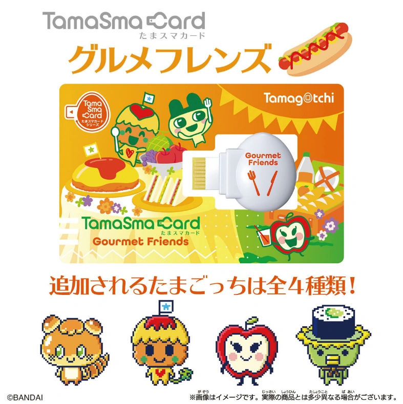 The Kei-Tama Friends and En-Tama Friends are a pair of TamaSma Cards sold as a set. The set is exclusive to Premium-Bandai and was released in November 2022. The cards were designed to honor four virtual pets from the Tamagotchi Plus era: the Keitai Tamagotchi Plus, the Keitai Tamagotchi Plus Akai, the Chou Jinsei Enjoi Tamagotchi Plus, and the Ura Jinsei Enjoi Tamagotchi Plus. The set includes a pack of eight stickers featuring various characters from the era.
