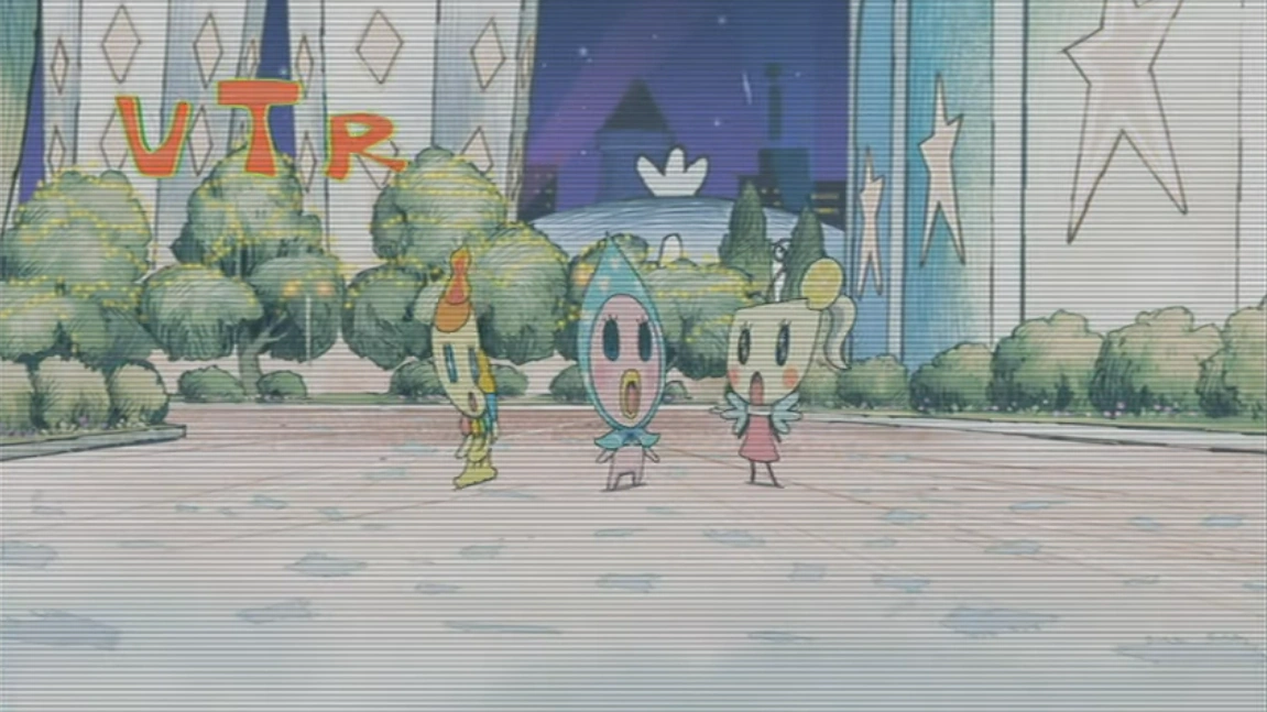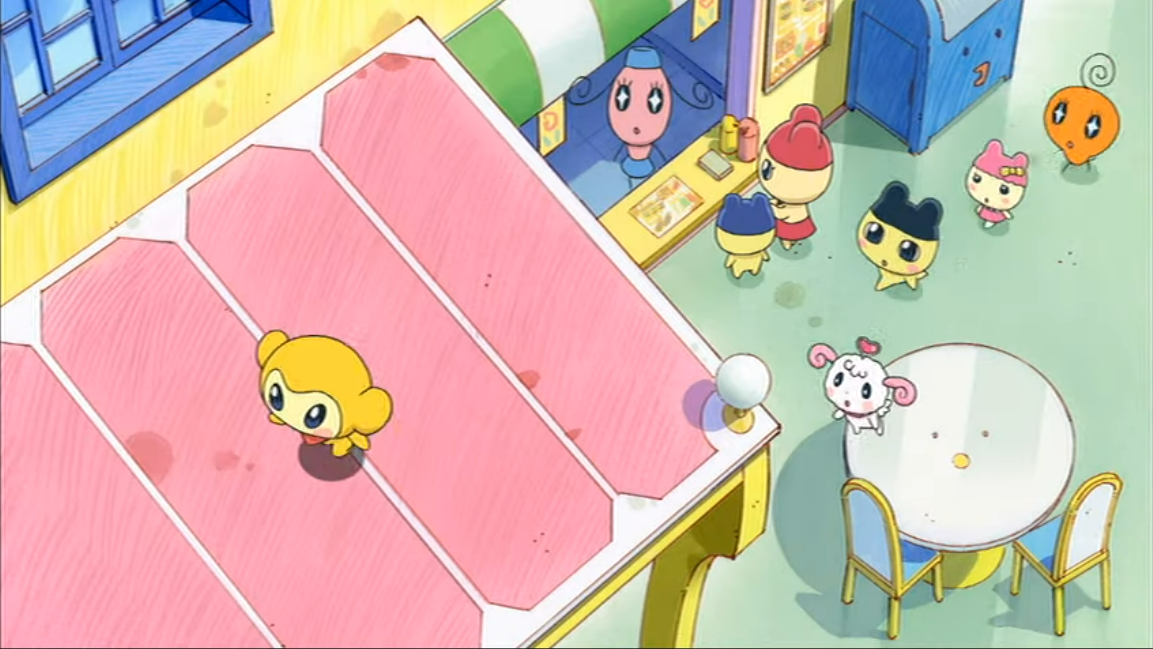 - Mametchi running upside down in the World's Happiest Story while Memetchi and Kuchipatchi watch him.