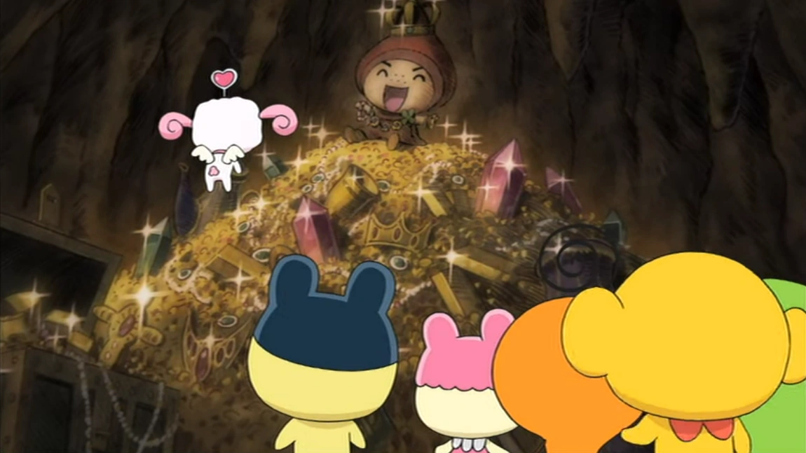 Mametchi's family and friends celebrate the birth of Hapihapitchi with cake and drinks. After seeing an advertisement for Celebria on TV everyone agrees to go there later for fun. The scene changes to Kikitchi at his luxurious home in Celebria. He eats a meal by himself and turns on the TV to see his parents, Monsieur Kikipapa and Madame Kiki, explain that they built Celebria as a place where all Tamagotchis could go to have fun. Kikitchi sadly turns off the TV and watches the fireworks outside the window.