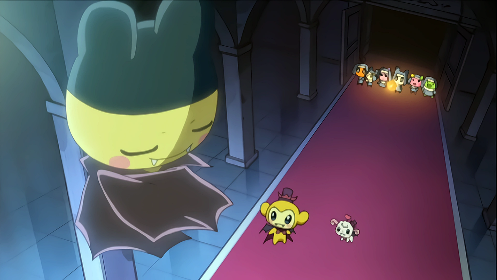 At the castle gate, Kuchipatchi hits the bats with a stick which makes them poof in black smoke. He goes to hit more, but Vampire Kikitchi and Vampire Hapihapitchi steal his stick and taunt him before flying away to the castle with the rest of the bats. The sisters run to the castle, but it is too late. Kikitchi has already started the ritual and awakened Mametchi who flies into the air and declares that his vampire blood feels restless. The sisters run away in fright as Mametchi also declares that they'll spread evil upon the world. The sisters make it back to the gate, but Makiko trips and falls. Memetchi tries to go back for her, but Lovelin forces her to keep running away as Mametchi appears behind Makiko, who looks at him with terror.