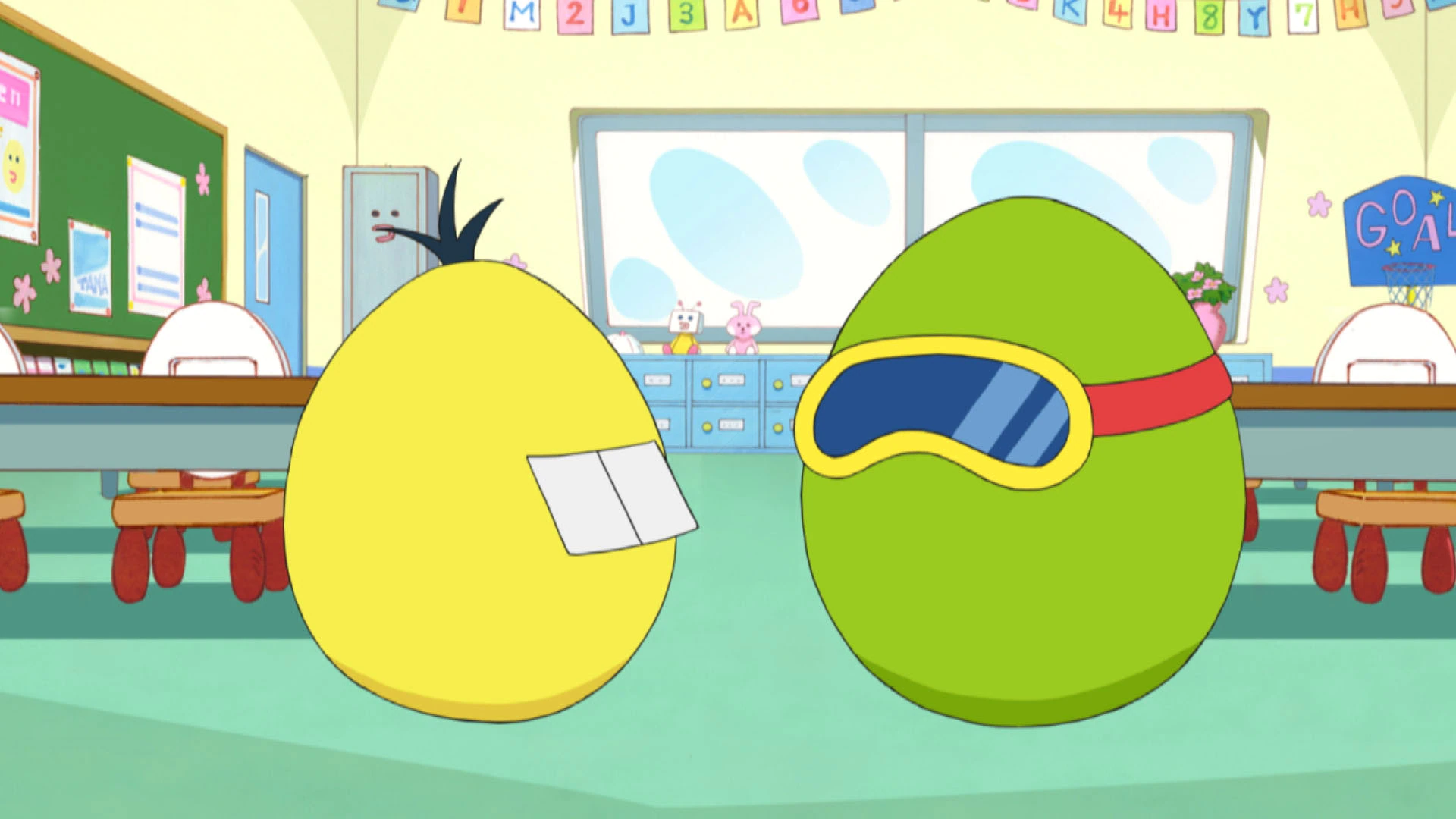 The next day, Mametchi, Memetchi, and Kuchipatchi go to school and walk into class. To their shock, Sunopotchi and Debatchi have turned into eggs and Mametchi notes to himself that he's seen this happen on the news.