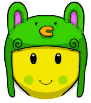 Thrillgurutchi is a yellow Tamagotchi with a round head and slim body. They have black oval eyes, green cheek highlights, and two curls poking out from under their green bunny hood hat.