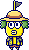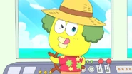 Tourcontchi has yellow skin, bushy green hair, blue irises, and a pale yellow beak. He wears a tropical flower shit, tan shorts, and a straw hat with a flag on top. His flag and shirt are usually red, but may change color based on the location he's at.