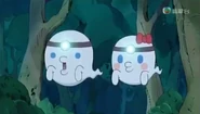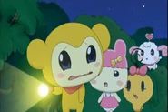 Elsewhere, Lovelitchi and Memetchi walk together feeling slightly spooked by the forest. Telelin starts mentioning the ghosts that must haunt the forest and Lovelitchi quickly shoves her back in her purse. When they come close to Kuchipatchi's hiding spot, he drops a wet rag on Lovelitchi's face, unnerving her. Back at Kikitchi's group, the four find a triangle shaped rock after Kikitchi stops running. Chamametchi thanks Kikitchi for leading them to the coins and he accepts, pretending that he purposely lead them there. As Kikitchi picks up a coin, he notices a blue glow behind the rock. The glow turns out to be a real ghost which chases after the group except Kikitchi who once again freezes in fear.