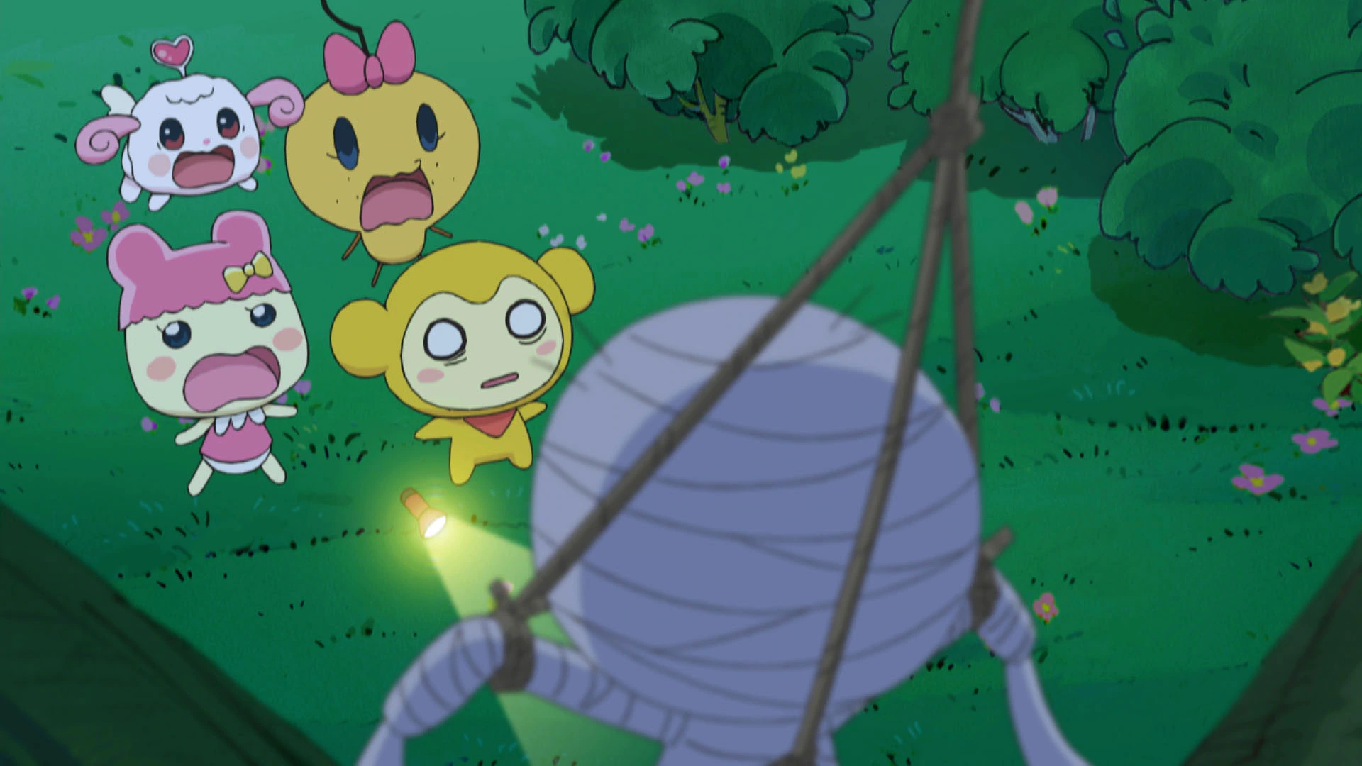One by one, the groups head into the forest with Kikitchi's group in the lead. Mametchi watches them and springs a trap on them, pulling a rope to drop a mummy right in front of them. As Kikitchi stands still in complete shock, everyone else runs away and screams. Eventually they realize they left Kikitchi behind and come back for him. Imotchi and Chamametchi praise Kikitchi for being brave and not running away, but he is unresponsive. Chamametchi gets him to come to his senses and he finally reacts to the mummy, running away and screaming.