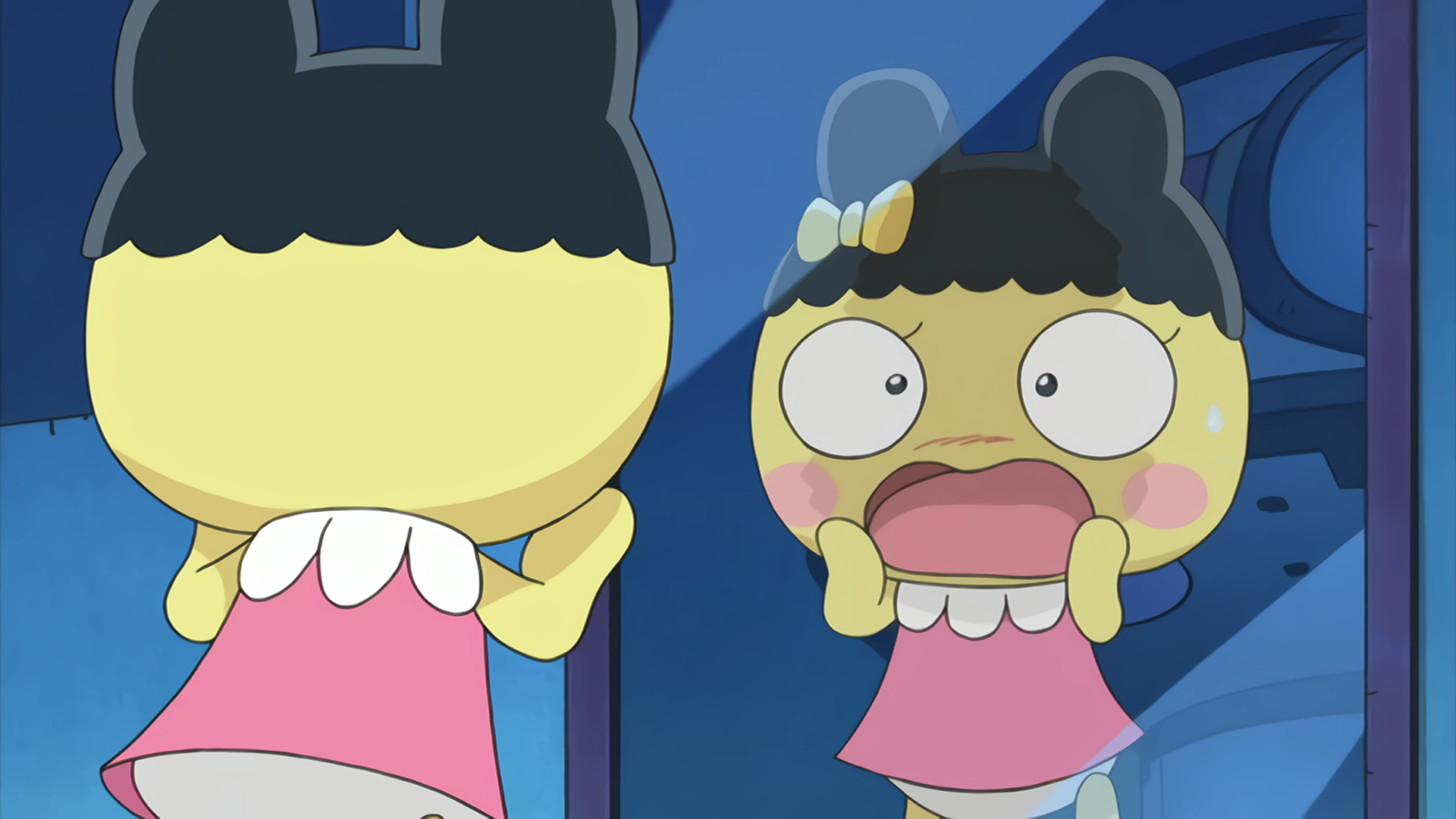 What? Swapping Personalities! (ええっ!まめちゃまめっち Ee! Mamechamametchi) is part 1 of episode 7 of Tamagotchi!. It was broadcast on November 23, 2009, coinciding with the 13th anniversary of the Tamagotchi franchise.